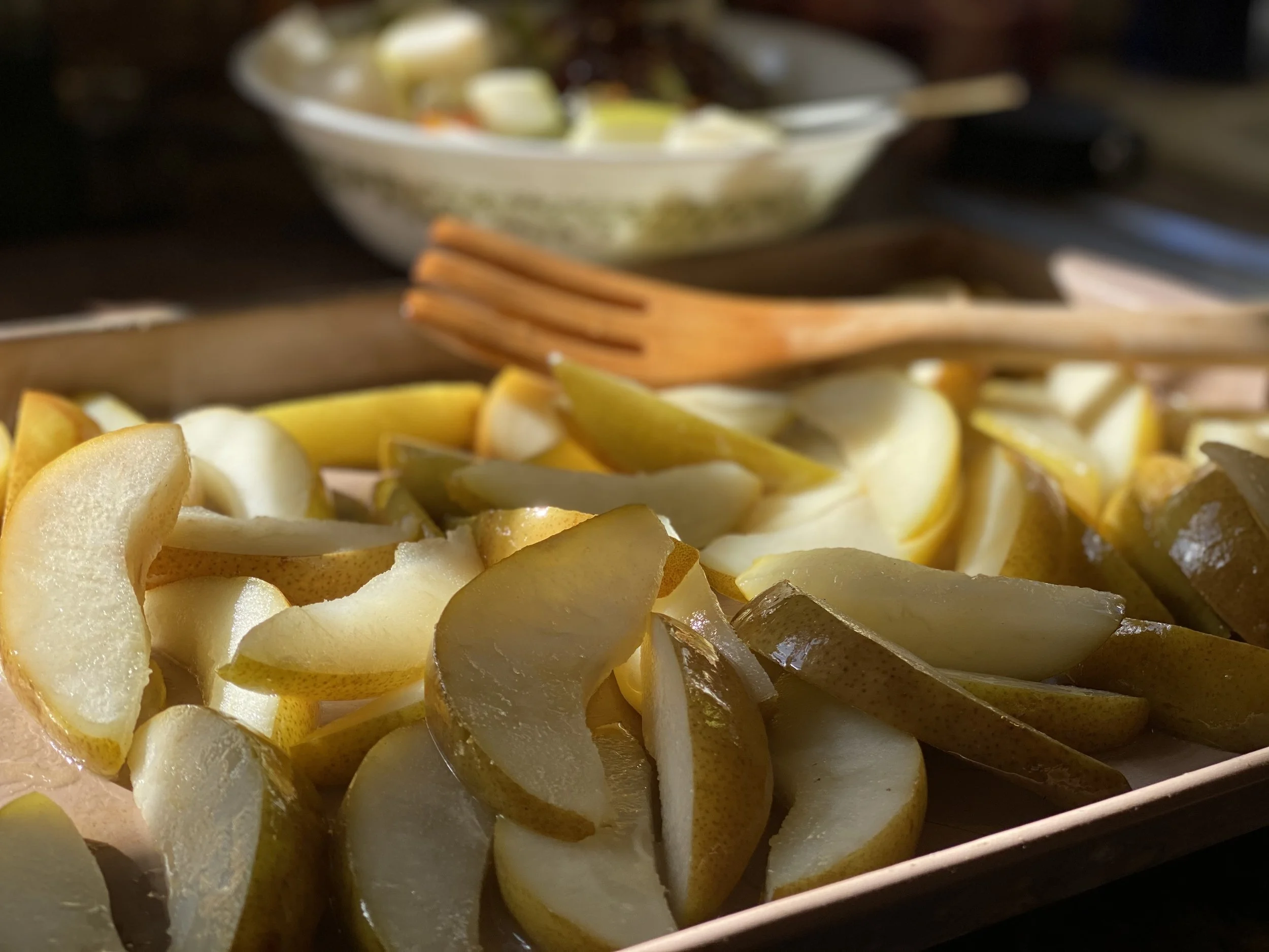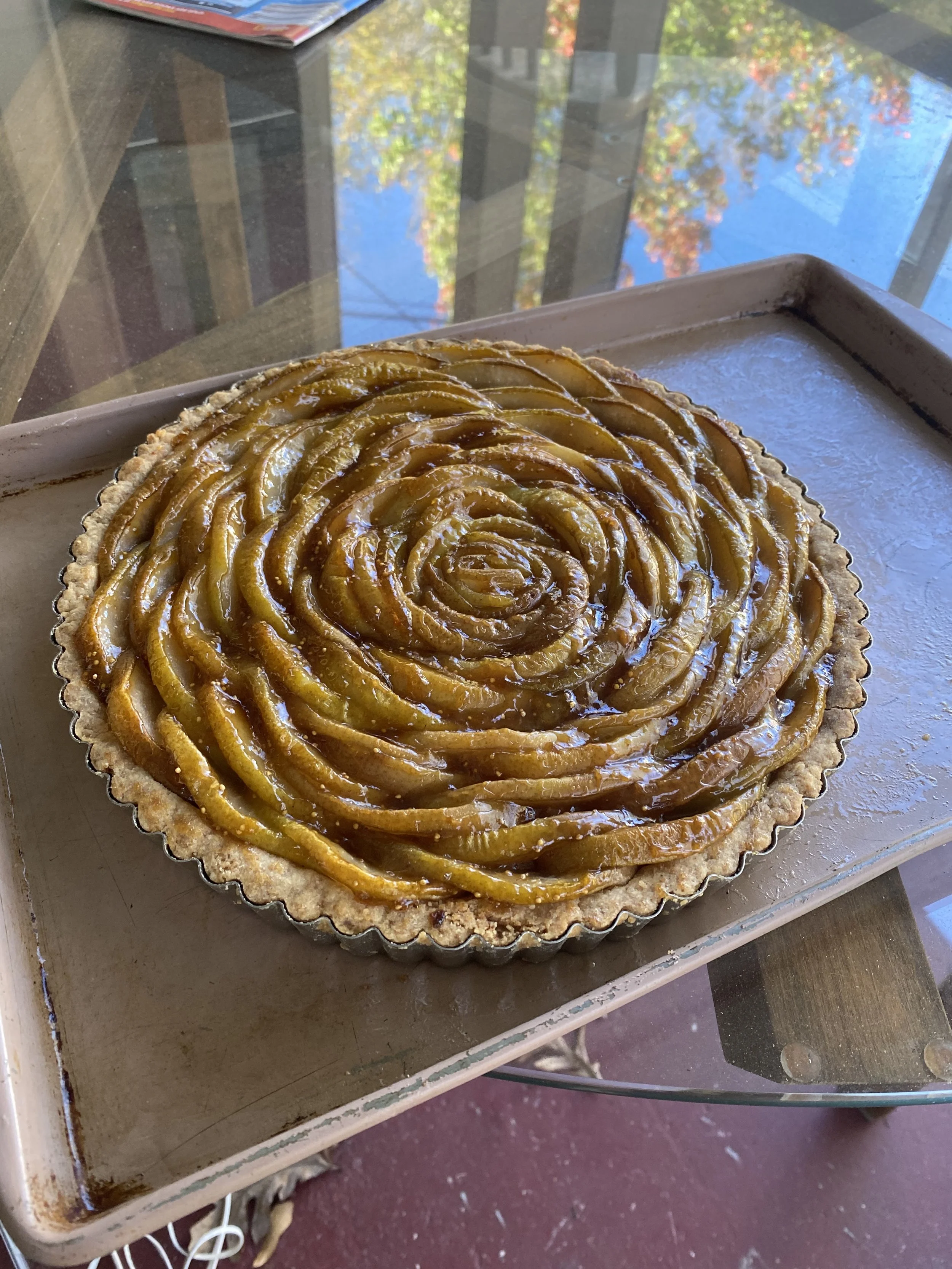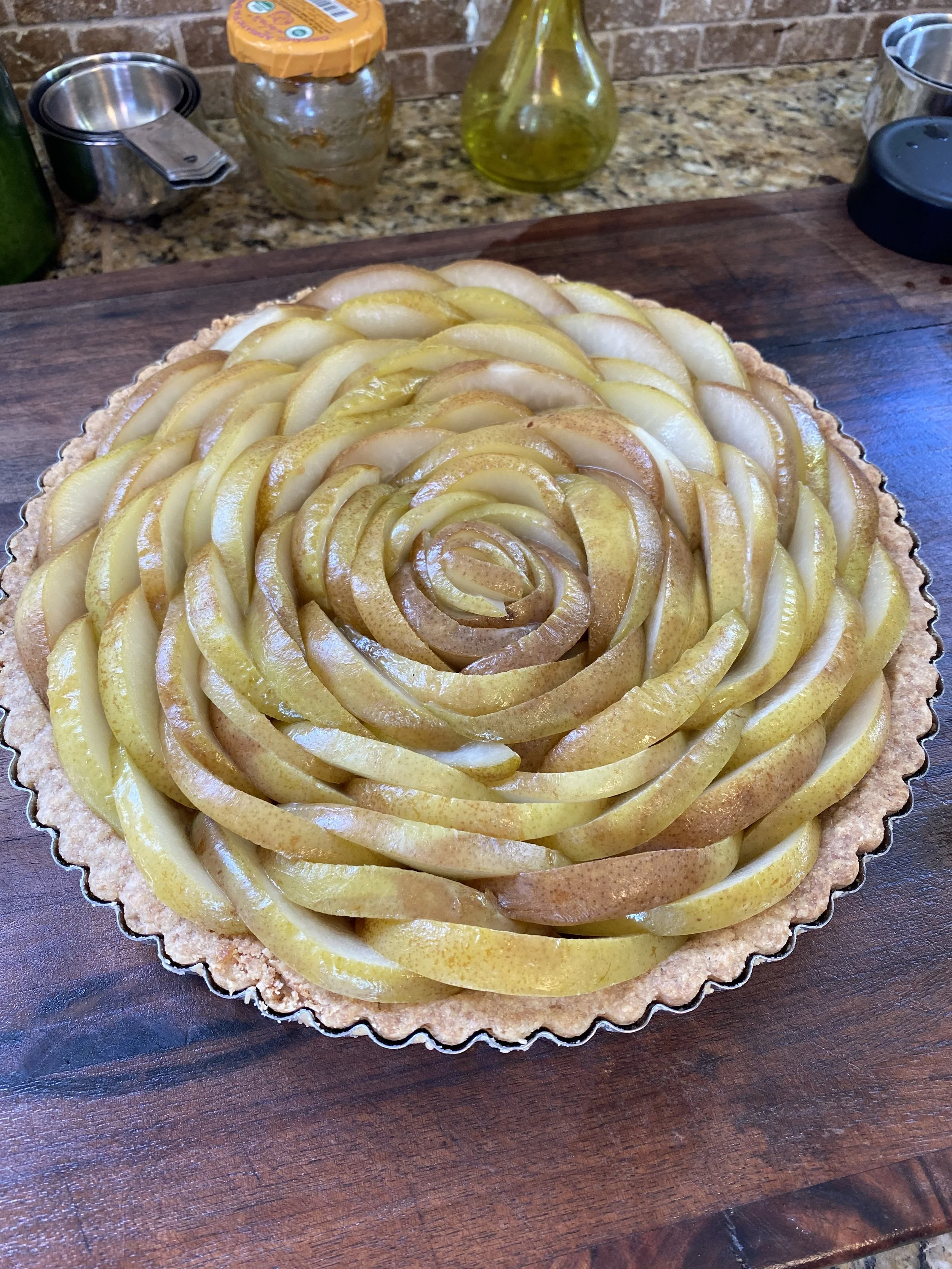 The pears — thin, even slices — were cool and slippery in my hands. I tucked them in one by one around the tart’s edge, each piece leaning into the next like overlapping petals. It’s meditative, almost. A kind of culinary mandala.