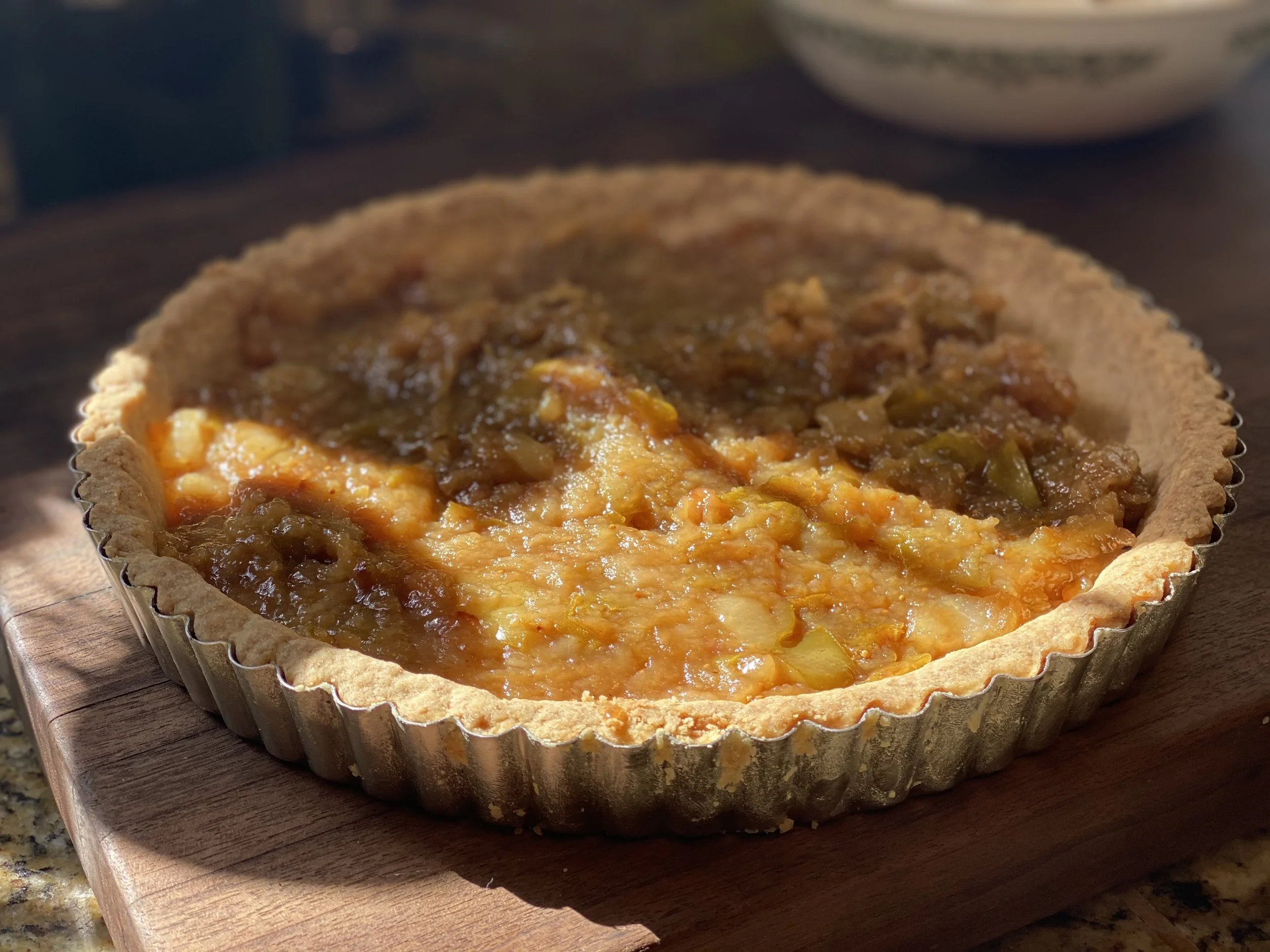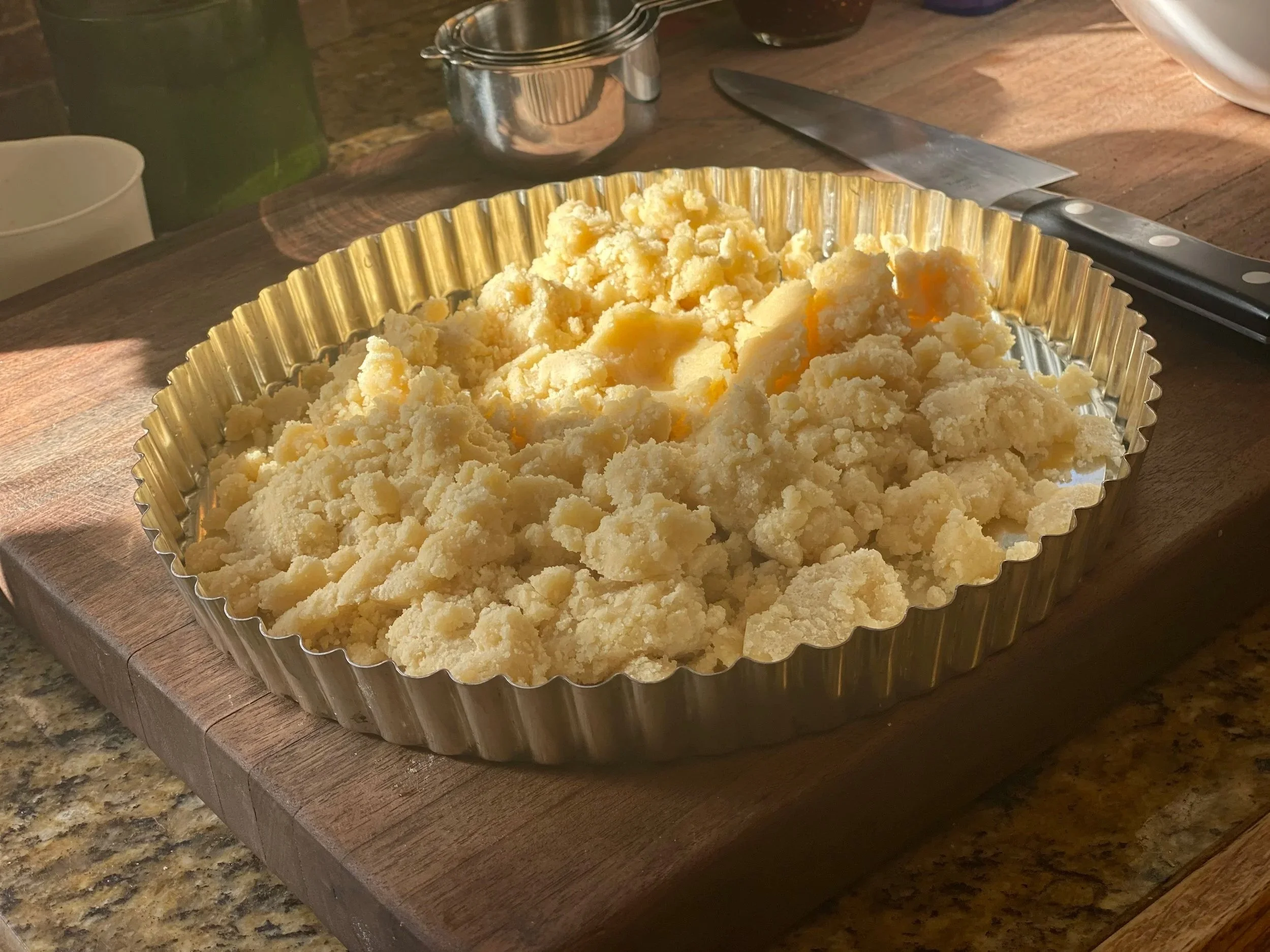 I always love a tart crust that behaves more like shortbread; forgiving, sandy, and deeply buttery. Instead of rolling, I press. Instead of fussing, I let the dough be rustic. The sunlight was hitting the board just right as I tipped the mixture into the tin, the crumbs falling like soft gravel. That’s always the moment I know it’s going to be a good bake; when the dough feels alive in your hands.