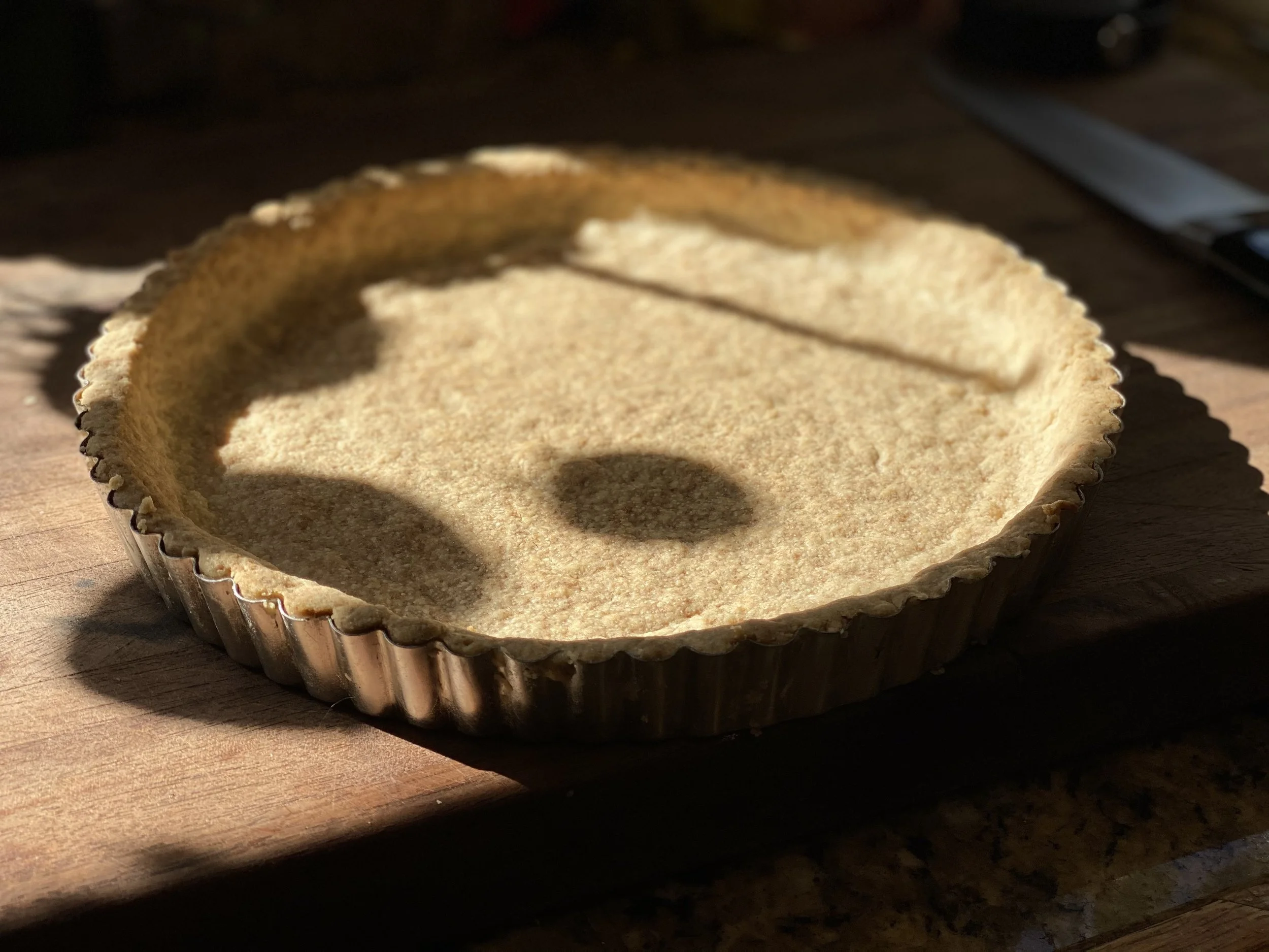 Once pressed and smoothed, the shell went into the oven until the edges turned golden and the whole thing smelled like the inside of a warm cookie.